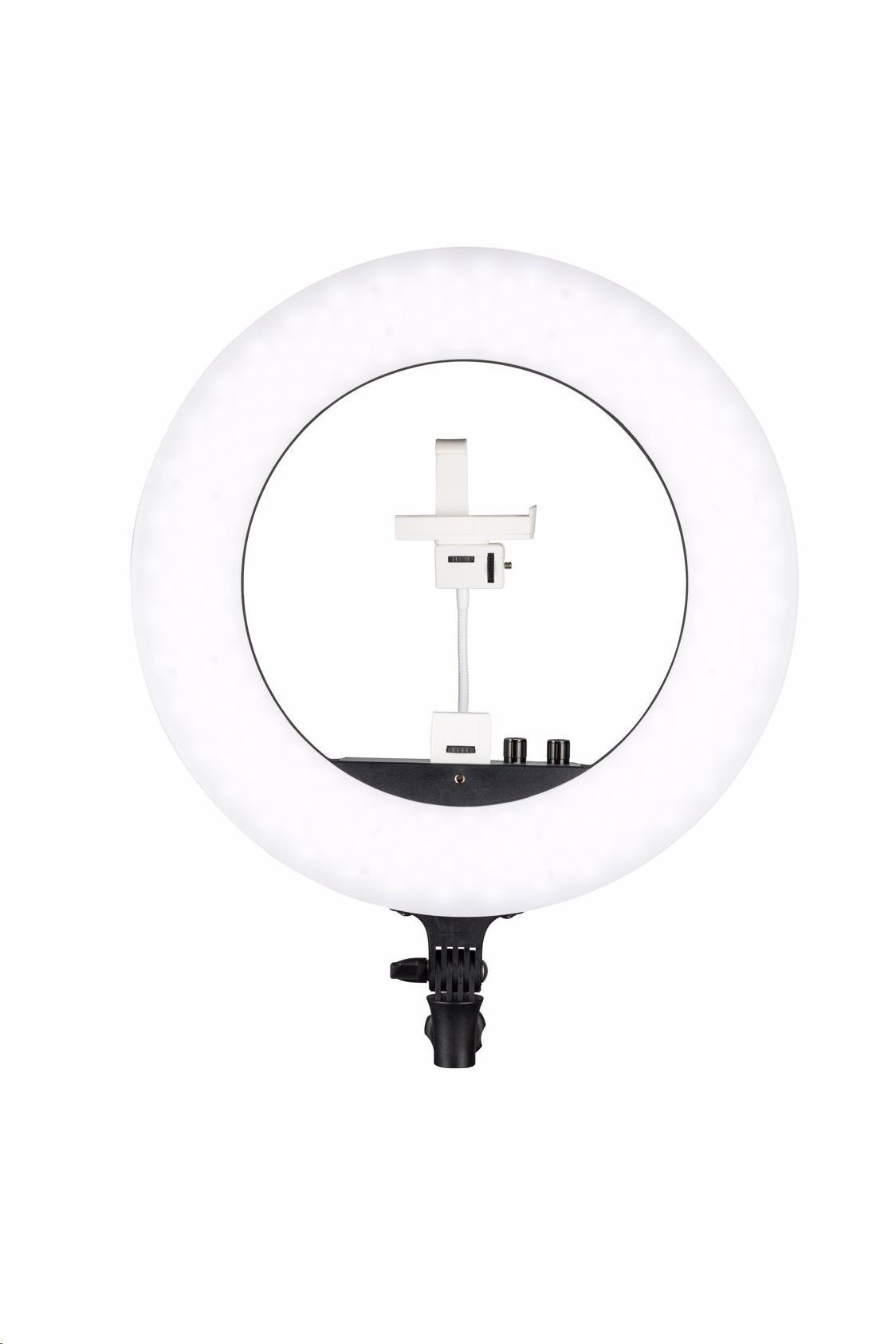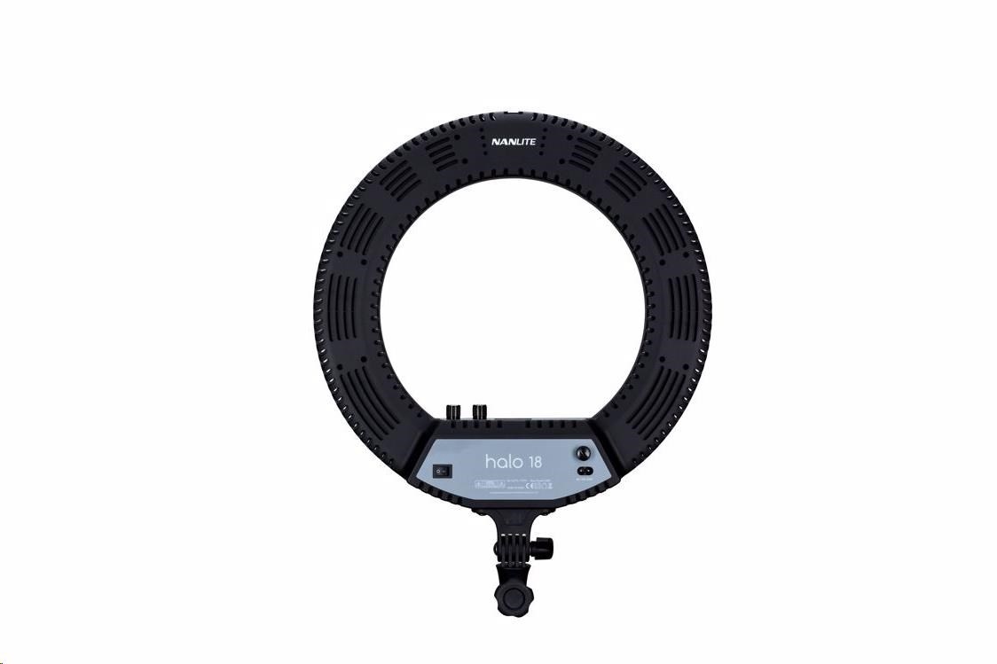 LED kruhové světlo Halo 18 lze napájet dodávaným AC adaptérem. Díky standardnímu 5/8" závitu může být kruhové světlo upevněno na téměř jakýkoli světelný stativ (není součástí dodávky). Tato sada zahrnuje řadu příslušenství včetně držáku na mobilní telefon a oboustranného make-up zrcátka, z nichž jedno z nich lze upevnit přímo do středu kruhového světla.