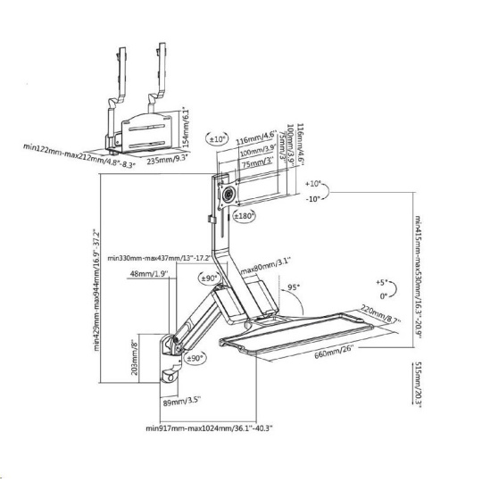 Nástěnná pracovní stanice monitor, klávesnice, PC Fiber Mounts M8C38 Kompletní pracovní stanice, držák monitoru 17-32", klávesnice a PC Toweru Kvalitní nástěnný systém pro vytvoření pracovní nebo informační stanice - 3D polohovatelný držák na monitory 17-32" včetně poličky na klávesnici i s myší + univerzální nástěnný držák na PC Tower. Plná polohovatelnost držáku monitoru s policí - otáčení, naklápění, výškové polohování, rotace monitoru, korekce roviny, možnost zaklopení police. Police na klávesnici (a myš) má rozměr 660 x 220mm, možnost naklopení nebo zaklopení. Na držáku je i přihrádka na vizitky, katalogy apod. Nástěnný držák na PC Tower má nosnost 15kg. Barevné provedení černé. Záruka 3 roky. Plnohodnotná nástěnná pracovní stanice na monitor, klávesnici s myší a PC Tower, plně polohovatelné, TOP kvalita - Fiber Mounts M8C38 Technické údaje: maximální hmotnost monitoru 9kg maximální hmotnost PC Toweru 15kg velikost monitoru 17" až 32" držák monitoru podporuje VESA 75x75 a 100x100 kompletní polohovatelnost držáku monitoru s policí otáčení do stran, naklápění, nastavení výšky a vzdálenosti od zdi výškové polohování až o 515mm funkce pivot držáku monitoru police na klávesnici o rozměrech 660x220mm možnost náklonu až 5°, možnost zaklopení k monitoru nástěnný držák na PC Tower včetně popruhů instalační materiál systém vedení kabeláže barevné provedení černé záruka 3 roky.