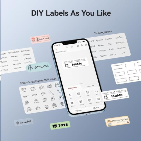 Při navrhování štítku můžete použít různá písma, tvary, ikony, velikosti a formáty, abyste si vytiskli etikety nebo štítky podle své představy. Můžete importovat fotografie z vašeho telefonu nebo obrázky z internetu, aby byl design jedinečnější. Bezplatná aplikace pro iOS nebo Android nabízí více než 1500 ikonek, více než 100 rámečků, 19 fontů písma a umožňuje také tisk QR kódů. Můžete si vybrat z různých stylů písma, velikostí a formátů, abyste si vytiskli etikety nebo štítky přesně podle své představy. Tiskárna automaticky rozezná vložené etikety a aplikace přizpůsobí rozměry pro tisk.