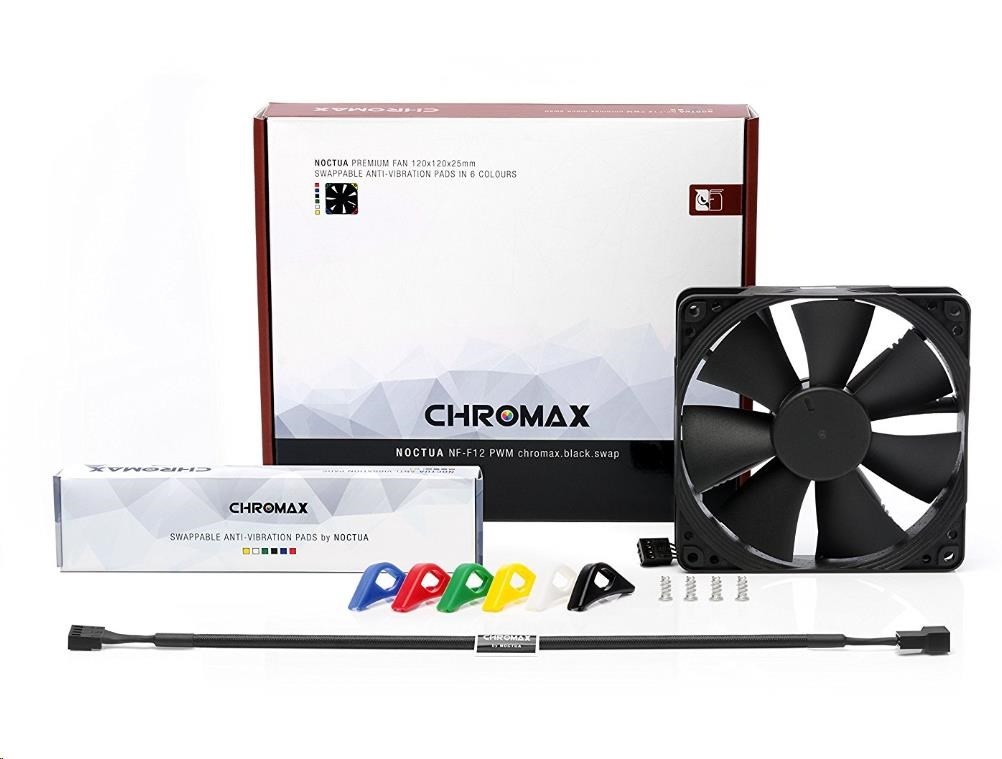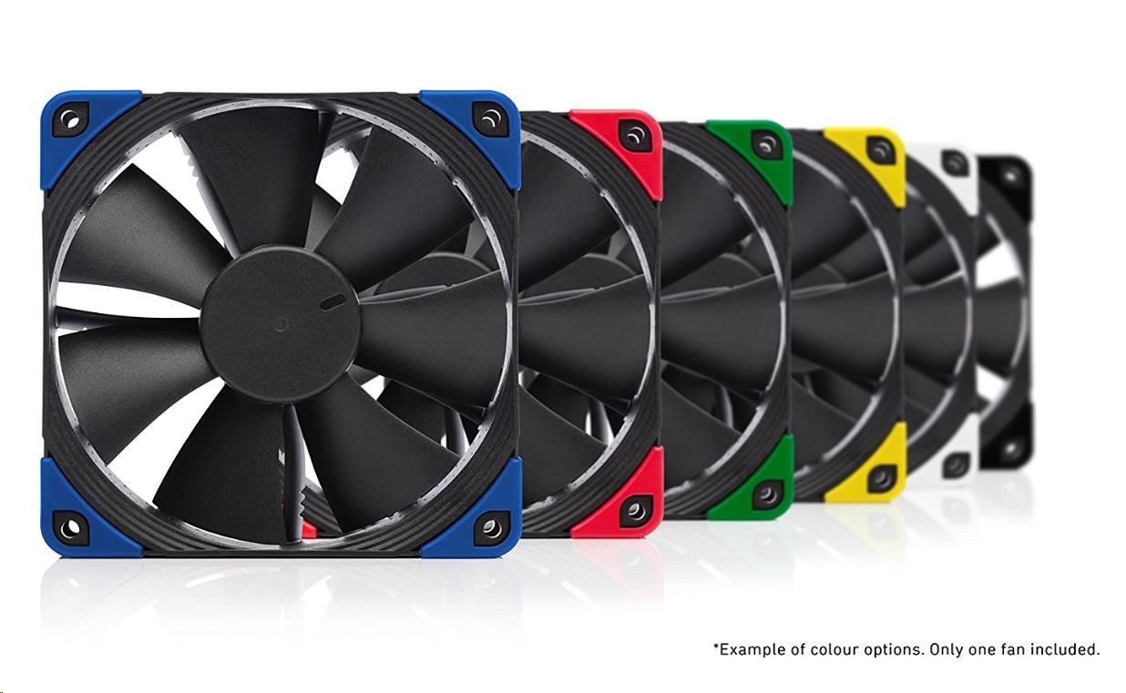 ventilátor, tichý, rozměry 120x120x25mm, hlučnost 18.6 až 22.4dB, průtok 74.3 až 93.4 m3/h, 300 až 1500 otáček, optimalizovaná geometrie a povrch 7 lopatek, SSO2, edice Chromax - vyměnitelné barevné antivibrační podložky