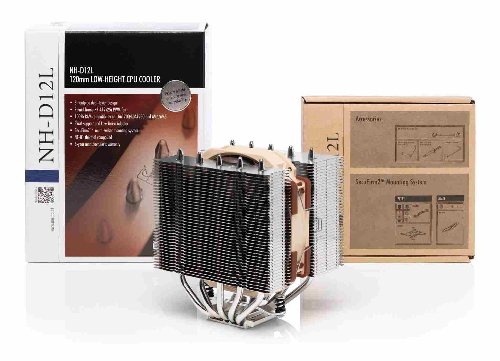 Nízký 120mm chladič CPU Noctua NH-D12L kombinuje výjimečně efektivní chlazení s nezvykle širokou kompatibilitou i s menšími PC skříněmi - teď už nepotřebujete obrovské skříně, abyste uchladili i ty nejvýkonnější stroje. I přes menší konstrukci dokáže NH-D12L chladit efektivněji, než i přední 120mm chladiče, jako například známý model NH-U12S. Při namontování jednoho ventilátoru je díky asymetrické konstrukci 100% kompatibilní s RAM i u patic AMD AM4/AM5 a Intel LGA1200/LGA1700. Perfektní volba pro ty, kteří potřebují špičkový výkon, ale nemají dostatek prostoru pro větší chladič Noctua NH-U12A.