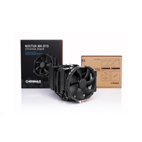 NH-D15 chromax.black je černá verze oceněného modelu NH-D15, špičkového tichého chladiče procesoru společnosti Noctua. Díky stejné osvědčené konstrukci chladiče dual-tower a ventilátorům NF-A15 PWM zůstává věrný úspěšnému NH-D15, který se vyrovná výkonu vodních chladičů typu all-in-one při zachování vynikajícího tichého provozu. Verze chromax.black s černými ventilátory a chladičem s černým povrchem zároveň kombinuje tyto přednosti s elegantním stealth vzhledem. NH-D15 chromax.black, doplněný o proslulý systém montáže SecuFirm2 do více socketů, tepelnou směs Noctua NT-H1 pro nadšence a plnou 6letou záruku výrobce, je luxusní volbou pro overclockery i tiché nadšence, kteří hledají chladič elitní třídy, který vypadá stejně skvěle jako chladí.