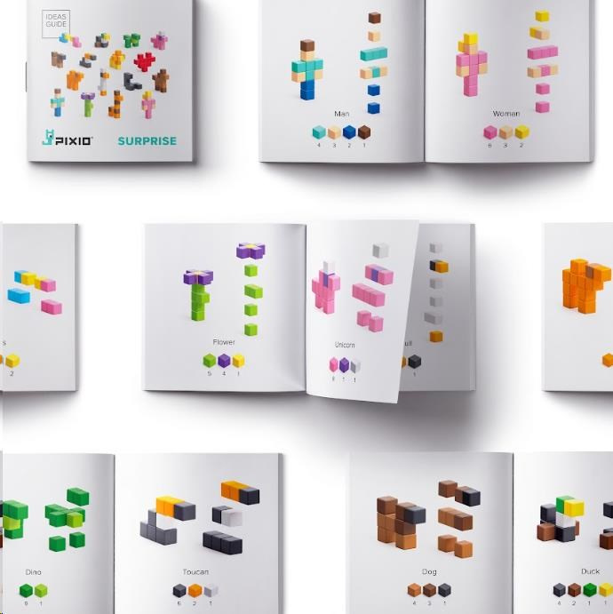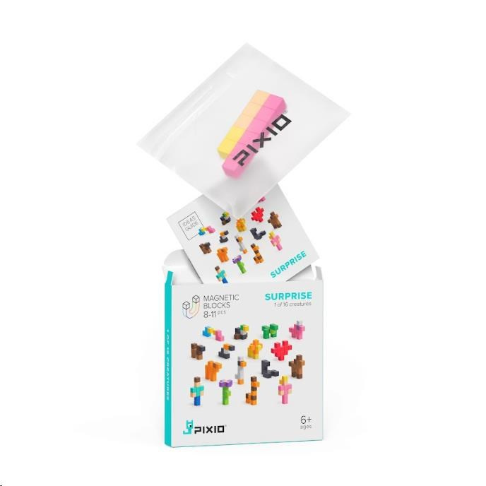 Stavebnice PIXIO 60101 - Surprise (Překvapení) je vstupem do světa Pixio. V každém balení můžete najít jeden ze 16 kompaktních modelů, skládajících se z 8-11 kostek. Jsou velmi jednoduché, se snadným postupem sestavení, takže budou zábavné i pro Pixio nováčky. Kostky všech 16 modelů dohromady tvoří materiál na stavbu větších a barevnějších výtvorů. Pokyny ke stavbě bonusových modelů najdete v pixio aplikaci. Pixio je splněný sen pro fanoušky Pixel Art, hráče Minecraftu a všechny, kdo si prostě rádi hrají. Použijte jej jako učební zdroj pro rozvoj kreativity dětí. Obsahuje náhodný mix 8-11 kostek, se kterými složíte jeden ze 16 modelů řady Surprise, nebo cokoliv jiného podle své fantazie.