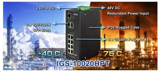 Planet IGS-10020HPT PoE switch 8x 1000Base-T, 2x SFP, 802.3at 270W, IP30, -40 až 75°C, SNMP, IGMPv3, IPv6