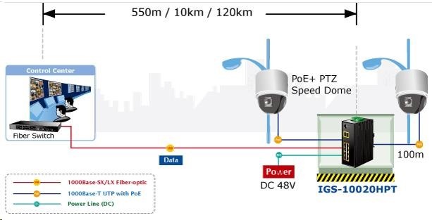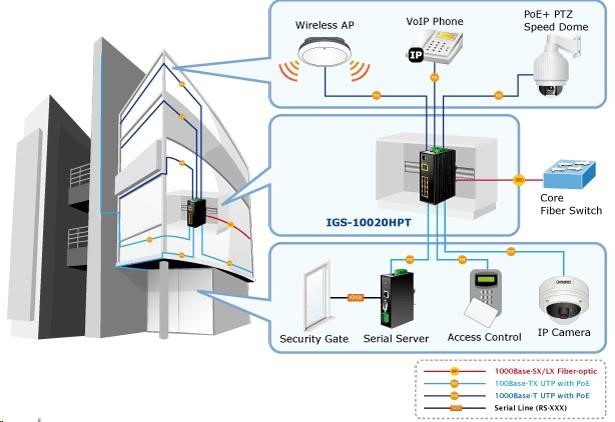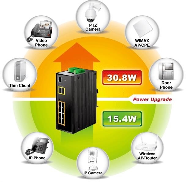 Průmyslový spravovatelný přepínač 8x 10/100/1000Base-T, 2x SFP 100/1000Base-X, včetně PoE IEEE 802.3at injektorů, výkon až 270W. Podpora IPv6, Web/SNMPv3 management, 255 VLAN 802.1Q sítí, Spanning Tree, Rapid Spanning Tree, agregace linek 802.3ad LACP, Port shaper, QoS. Alarmový výstup při výpadku, krytí IP30, hliníková skříň, pracovní teplota -40~75°C. Přepěťová ochrana ESD+EFT LAN i napájecích portů do 6kV. Montáž na DIN lištu nebo přímo na zeď..... více