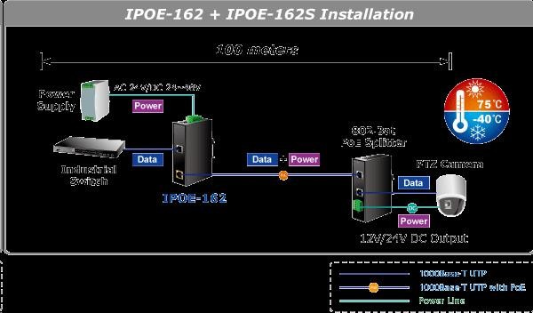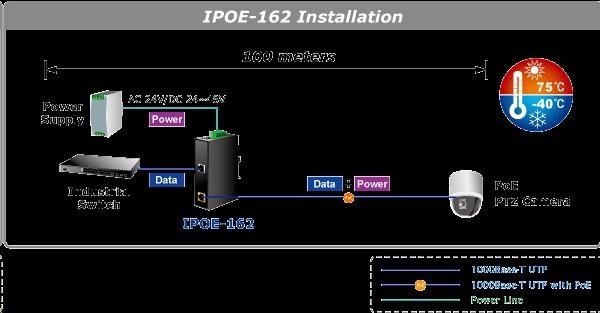 Planet IPOE-162 napájení po ethernetu IEEE802.3at, 30W, Gigabit, DIN, IP30, -40 až 75 C