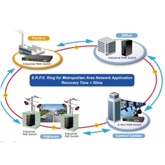 witch obsahující 8 x RJ-45 port s rychlostí 10/100/1000 Mbps a PoE napájením, 2 x RJ-45 s rychlostí 10/100/1000 Mbps sdílené s dvěma SFP porty. Navíc je vybaven interním ONVIF modulem pro detekci a info IP kamer v síti. Díky svému kovovému pouzdru s krytím dle certifikace IP30 odolává vysokým teplotám od -40°C do 75°C a i díky tomu je vhodný do těžkých provozů. Přepínací kapacita switche je 24 Gbps neblokovaně a propustnost činí 17,85 Mpps. Pro každý z osmi RJ-45 portů je k dispozici 36 W PoE výkonu, takže je možno napájet i energeticky náročnější zařízení. Taktéž jsou přítomny dva SFP porty pro rychlé datové přenosy na optické síti.