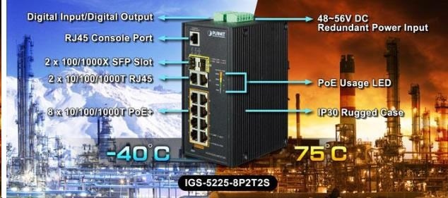 Planet switch IGS-5225-8P2T2S, PoE 8x 1000Base-T, 2x SFP, L2, SNMPv3, ONVIF, -40 až 75°C, 2x DC, IP30, 802.3at 240W