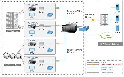 Výkonný LRE (Long Reach Ethernet) konvertor ethernetu na VDSL2 (Very-high-data-rate Digital Subscriber Line 2) dovoluje přenést data symetrickým párem vodičů rychlostí až 100Mbitů/s na 300m nebo 50/2Mbps do vzdálenosti až 1,4km. Zařízení je univerzální jako master (CO) / slave (CPE) jednotka, nastavení režimu přepínačem. Jednotka podporuje VDSL2 operační módy "17a" a "30a" a také "band Plan997" postihující symetrický přenos dat vyšší rychlostí. S pomocí externího spliteru lze zachovat hlasovou službu na telefonním vedení bez další úpravy zapojení, datový provoz se jednoduše přidruží k existujícímu hlasovému. S výhodou tak lze využít telefonní kabelová vedení původně určená pro spojení nejenom k účastníkům ale i mezi analogovými ústřednami. ISP (internet service provider) je tak umožněno nabízet multimediální služby, VOD (video on demand), VoIP (voice over IP), Video phone, IPTV, apod. Router lze úspěšně provozovat nad VDSL linkami O2. Vlastnosti: - 1 port VDSL, konektor RJ-11 - 1 port LAN 10/100Base-TX, Switching, Full Duplex (100/200 Mbps), Auto-Negotiation (10/100 Mbps) - přenos paketu o délce až 1536 bytes - transparentní pro IEEE 802.1Q VLAN tag - parametry nastavované DIP přepínači na zařízení: volba CPE/CO, volba modulace, volba komunikačního limitu, volba SNR - podpora standardů: IEEE 802.3, 10Base-T, IEEE 802.3u, 100Base-TX, IEEE 802.3x - splňuje VDSL standardy ITU-T G.993.1, ITU-T G.997.1, ITU-T G.993.2 - rozměry 90x70x26mm - hmotnost: 199g - externí zdroj 5V/2A - provozní teplota okolí: 0 až 50°C - lze instalovat do modelů šasi: MC-700 / MC-1500/ MC-1500R Dosahy a rychlosti na vedení s vodiči AWG24 a lepších: > 17a profil (Downstream / Upstream) - 200m -> 86/65Mbps - 400m -> 86/52Mbps - 600m -> 81/36Mbps - 800m -> 72/19Mbps - 1000m -> 60/9Mbps - 1200m -> 59/6Mbps - 1400m -> 49/2Mbps > 30a profil (Downstream / Upstream) - 300m -> 100/100Mbps - 400m -> 90/90Mbps - 600m -> 61/40Mbps - 800m -> 54/8Mbps Nastavení pro O2 VDSL připojení - modem v režimu CPE; další DIP přepínače FEC, VDSL profil, SNR podle kvality linky (standardně FEC=Fast, VDSL=30a, SNR=9dB) - v routeru na WAN rozhraní aplikovat VLAN ID:848 - nad WAN nastavit PPPoE klienta, Login: O2/O2 - dále věnujte pozornost nastavení vašeho router, jeho firewallu, přístupových práv, UPnP, atd..