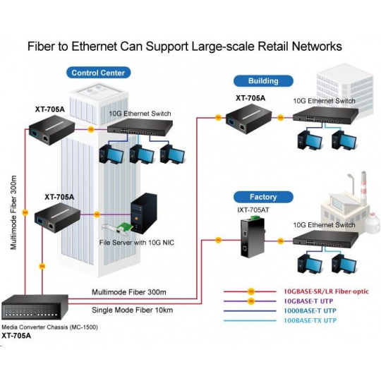 Jednoduchý media konvertor vybavený metalickým RJ-45 konektorem s rychlostí 100/1000/2,5G/5G/10G a optickým SFP+ portem s rychlostí až 10GBASE. Použití je vhodné v sítích, kde je vyžadována extrémně vysoká šířka pásma, jako jsou například data centra, cloudová úložiště, nebo infrastruktura operátorů. Díky spolehlivosti je zaručena vysoká přenosová rychlost bez rizika ztráty paketů při extrémní rychlosti. Samozřejmostí je ochrana až 6 KV DC ESD. Další výhodou je nízká spotřeba 3,75 W při plné zátěži. ZÁKLADNÍ SPECIFIKACE Fyzické vlastnosti: Porty: 1 x RJ-45 100/1000/2,5G/5G/10GBASE-T, 1 x SFP+ 10GBASE-XR Podpora přenosu: JumboFrame 16K Propustnost: sběrnice 20 Gbps, provozně 2,48 Mpps (64B) Tabulka záznamů: 9K MAC adres Provedení: vnitřní Napájení: zdroj 5V DC, 2A max., celkový příkon do 3,75 W Ochrana: ESD 6 KV DC Provozní teplota: 0 až 50°C Rozměry: 94 x 70 x 26 mm Hmotnost: 180 g.