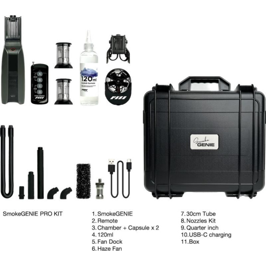 Profesionální sada SmokeGENIE, která umožňuje nezávislým tvůrcům vytvářet efekty mlhy, oparu, nízko visící mlhy a suchého ledu, je univerzální ruční zařízení, které poskytuje okamžitý kouř kdekoli a kdykoli. Rychle jím zamlžíte místnost a vytvoříte filmovou atmosféru nebo jej můžete použít venku při natáčení v náročných podmínkách.