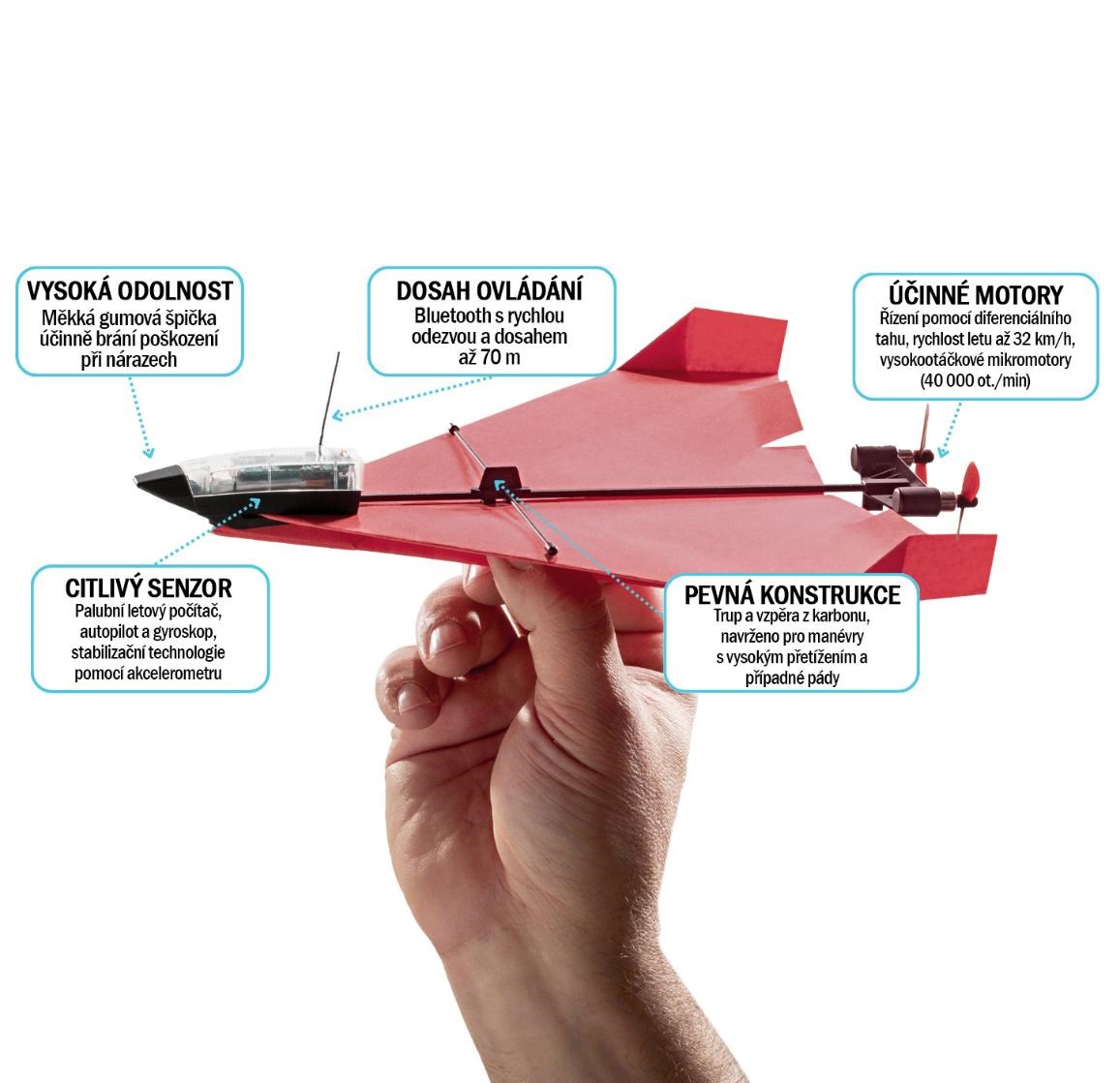Rychloupínací systém umožňuje experimentovat nejen s obyčejným papírem, ale i s lehkým kartonem, balzovým dřevem nebo pěnovými materiály. Palubní počítač navíc sám dorovnává drobné nepřesnosti ve skládání, takže i úplní začátečníci zažijí hladký let hned na první pokus.