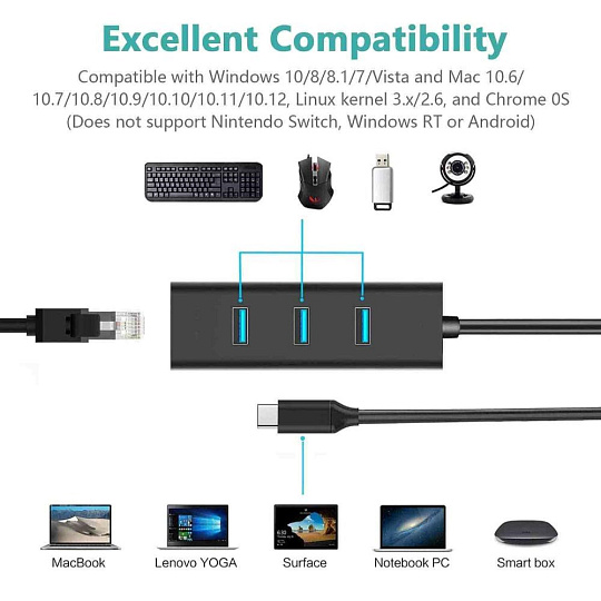 Převodník, který umožní připojit Váš počítač s portem USB typu C do internetu nebo k lokální síti pomocí kabelu s RJ45 a navíc umožňuje zapojit tři USB3.2 periferie jako USB disk, tiskárnu, klávesnici a myš