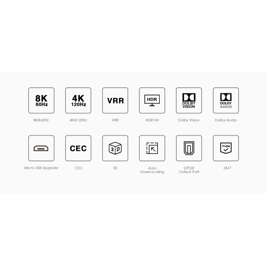 - Rozlišení: 8K@60hz, 4K@120Hz, 1080p