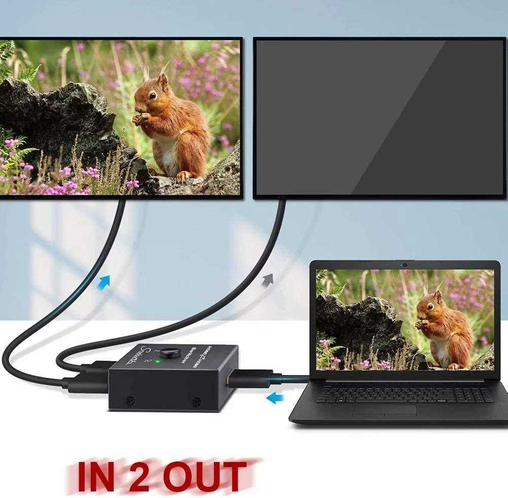 - Obousměrný 2x1 / 1x2 Přepínač HDMI lze použít dvěma různými způsoby: připojit 2 vstupní zdroje s 1 výstupním displejem nebo 1 vstupní zdroj se 2 displeji (funguje pouze na 1 obrazovce, nikoli současně).