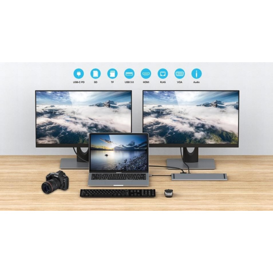 - Výstupní konektor: HDMI female + USB3.0 female + USB2.0 female + PD (power delivery) + čtečka karet SD/TF + RJ45 konektor na ethernet 10/100Mbps
