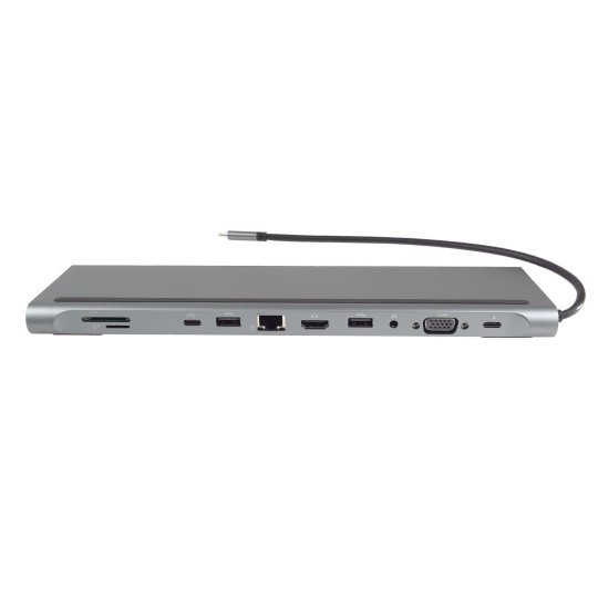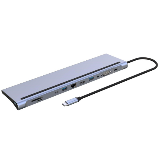PREMIUMCORD Dokovací stanice USB-C 10v1, 1xHDMI, 1xVGA, 2xUSB-C, 3xUSB, 1xRJ45, čtečka SD karet, šedá