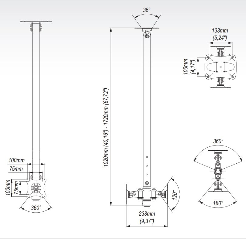 EDBAK SV35 stropní držák na 2 monitory Profesionální stropní držák na 2 obrazovky 17-43", výškové nastavení, otáčení, náklon Špičkový stropní držák pro zavěšení 2 televizorů nebo monitorů. Držák umožňuje délkové nastavení, nezávislé otáčení jednotlivých obrazovek a jejich naklonění. Profesionální konstrukce. Dodáváme v černém nebo stříbrném provedení. Záruka 5 let. Profesionální stropní držák na 2 obrazovky, nastavení délky, otáčení, náklon - EDBAK SV35 Technické údaje: max. zatížení 30kg podporuje VESA standardy 75x75 a 100x100 možnost rozšíření VESA na 200x100 nebo 200x200 vhodné na monitory a Tv 17" až 43" minimální délka držáku 1020mm maximální délka držáku 1720mm nastavení délky dle potřeby v uvedeném rozmezí nezávislé otáčení každého monitoru v rozmezí +90° / -90° nezávislé naklonění každého monitoru v rozmezí +60° / -60° možnost uchycení držáku na svislé stropní konstrukce 0° až 18° korekce roviny obrazovek horizontální i vertikální otočení obrazovek - funkce PIVOT bezpečné zavěšení 2 obrazovek profesionální konstrukce barva černá nebo stříbrná záruka 5 let Stropní držák na 2 obrazovky EDBAK SV35 podporuje VESA standardy: VESA 75x75 VESA 100x100 VESA 200x100 za příplatek VESA 200x200 za příplatek.