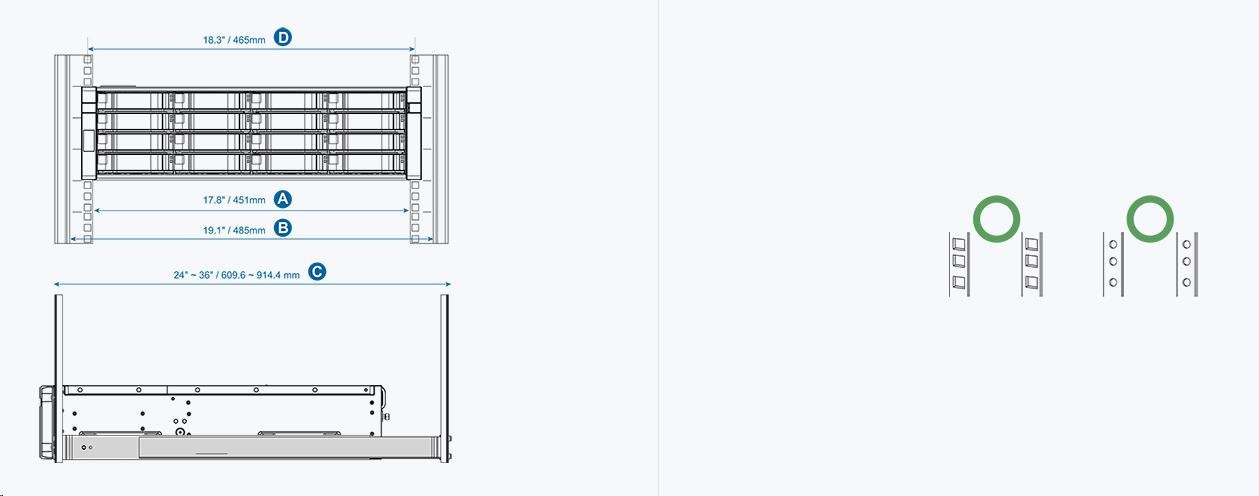 • Vzdálenost mezi dvěma rackovými sloupky (měření čtvercových otvorů racku střed-střed) je 18,3"(465 mm)