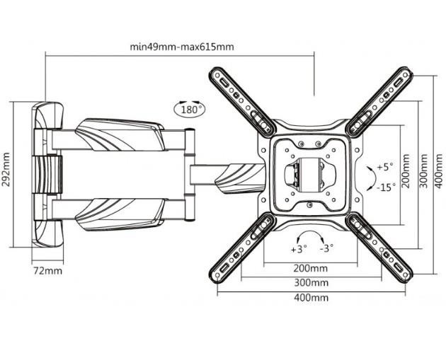 Nástěnný ocelový držák na LCD monitory a TV s uhlopříčkou 23"- 55" (58-140cm) a hmotností maximálně 35kg. 3x pant, vertikálně výklopný +5°/-15° a horizontálně otočný +90°/-90°, vzdálenost od stěny 49-615mm, materiál ocel, barva černá. Uchycení VESA: 75x75, 100x100, 100x200, 200x200, 300x200, 300x300, 400x200, 400x300, 400x400..