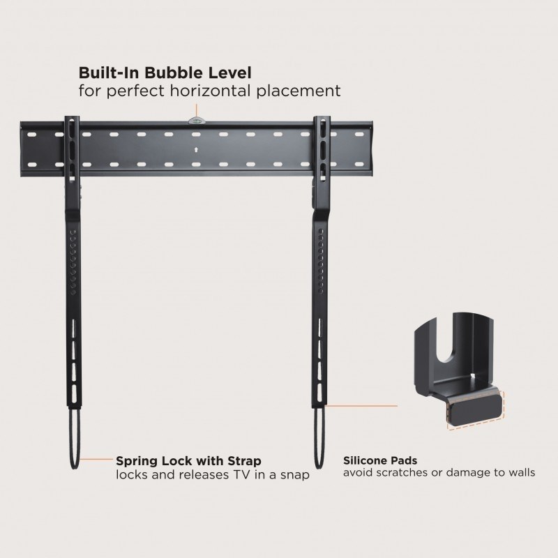 Nástěnný ocelový držák na OLED TV s uhlopříčkou 43"- 80" (109-203cm, různá tloušťka) a hmotností maximálně 40kg. Konzole na zavěšení TV s vodováhou, není vertikálně výklopný, max. vzdálenost od stěny 18mm, materiál ocel, zámek Spring Lock s páskou, cenově výhodné, barva černá. Uchycení VESA: 200x200, 400x200, 300x300, 400x200, 400x300, 600x300..