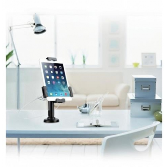 Bezpečnostní uchycení pro tablety 7,9-10,5" na stůl a na stěnu. Nastavitelný sklon tabletu rozmezí +70/-70° a navíc otočný 360°, fixace vruty ke stolu - 330° otočné kolem osy, hmoždinky do zdi, ocelové lanko proti odcizení, kabelový prostup, černý..