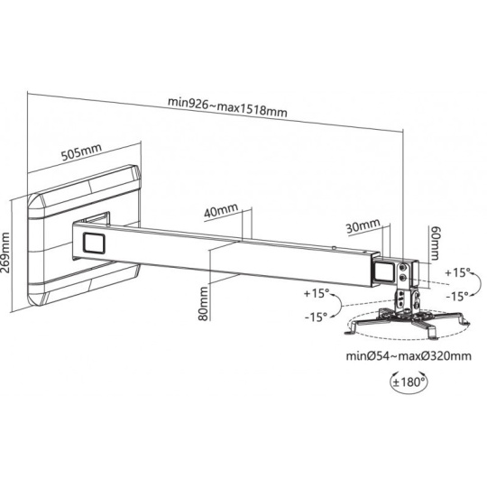 Nástěnný držák na dataprojektory - vzdálenost od stěny 93-152 cm, přístroj lze otočit o 360° a naklonit +/-15°, maximální zatížení 15kg, kabelový prostup, černý. Univerzální systém uchycení dataprojektorů (rozsah 5,4-32 cm)..