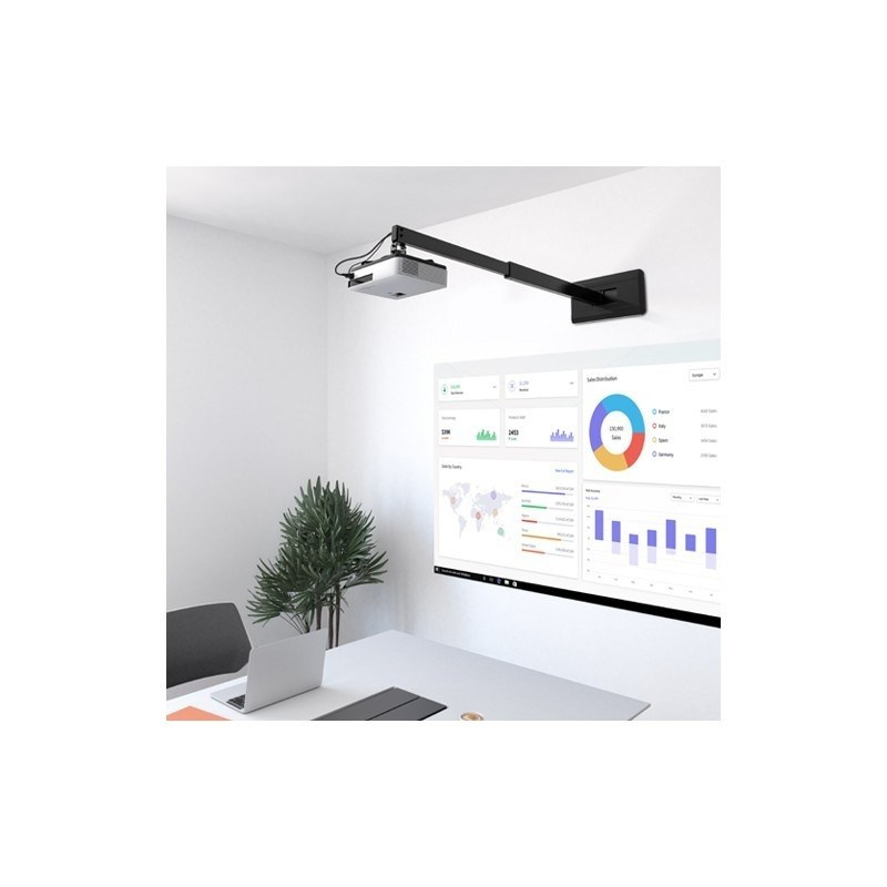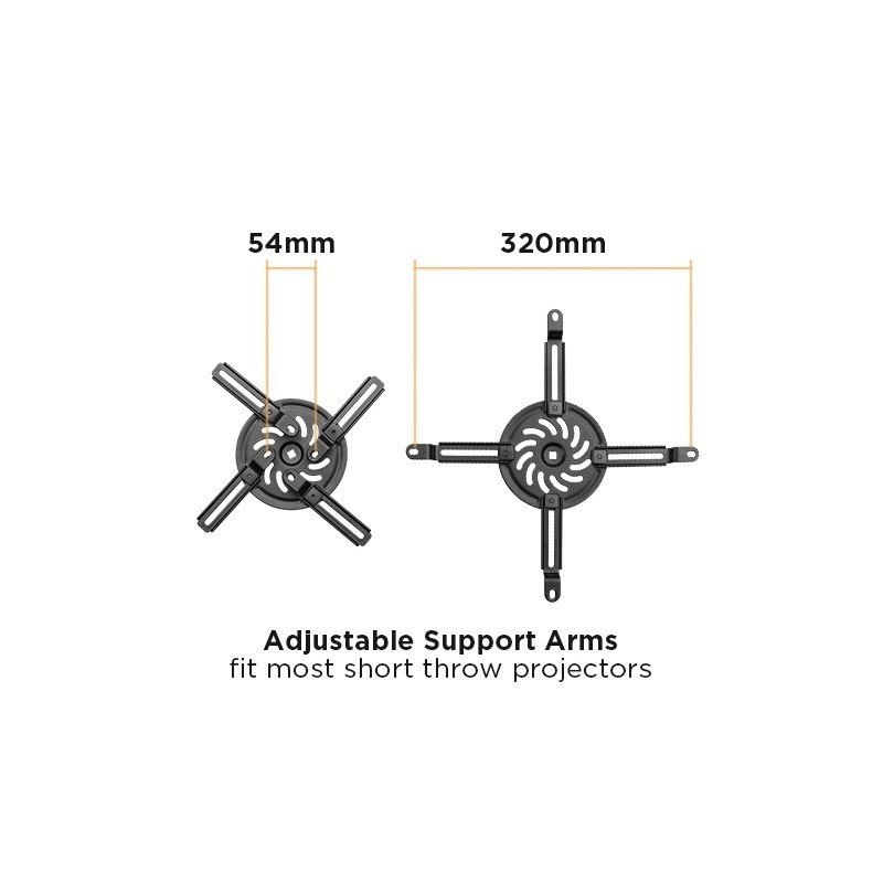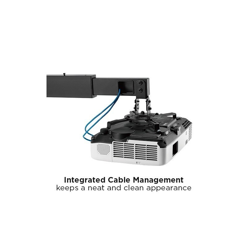 Nástěnný držák na dataprojektory - vzdálenost od stěny 93-152 cm, přístroj lze otočit o 360° a naklonit +/-15°, maximální zatížení 15kg, kabelový prostup, černý. Univerzální systém uchycení dataprojektorů (rozsah 5,4-32 cm)..