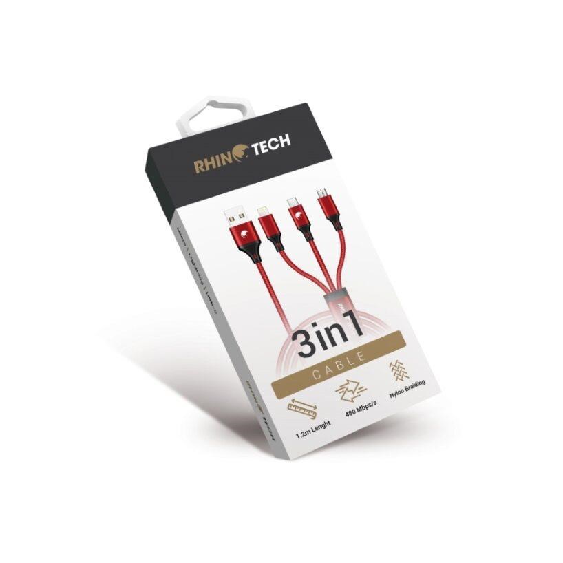 RTACC476 - RhinoTech nabíjecí a datový kabel 3v1 USB-A (MicroUSB + Lightning + USB-C) 1,2m červená