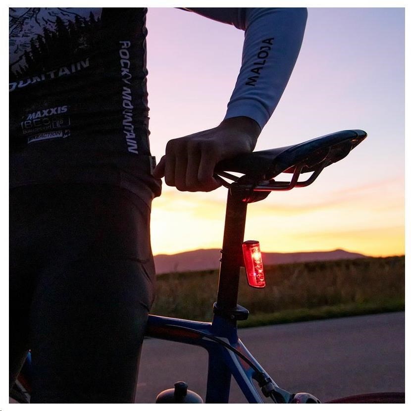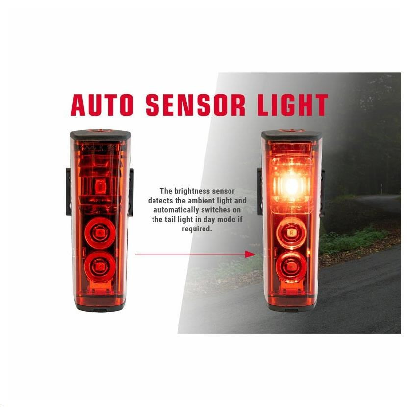 Senzor jasu detekuje okolní intenzitu světla a podle potřeby automaticky zapíná a vypíná zadní světlo. Šetří tak baterii a je ideální pro situace, jako jsou průjezdy tunely nebo jízda na temných lesních cestách.