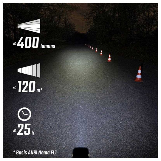 Někdy potřebujete na temných cestách plný výkon světla, jindy stačí být pouze viděn, s Buster 400 se vždy přizpůsobíte každé situaci. Máte na výběr z pěti světelných režimů, pomocí kterých můžete individuálně ovlivnit intenzitu osvětlení a dobu výdrže baterie. V režimu High dosahuje světlo Buster 400 světelného výkonu 400 lumenů po dobu až 2 hodin, v režimu Mid svítí až 4 hodiny při světelném výkonu 200 lumenů. A kdyby se náhodou vyjížďka protáhla, vydrží v režimu Low spolehlivě svítit až 9 hodin. S režimem blikání Night Flashing jste viditelní až 5 hodin, Day Flashing pak zajistí dobrou viditelnost po dobu až 30 hodin.