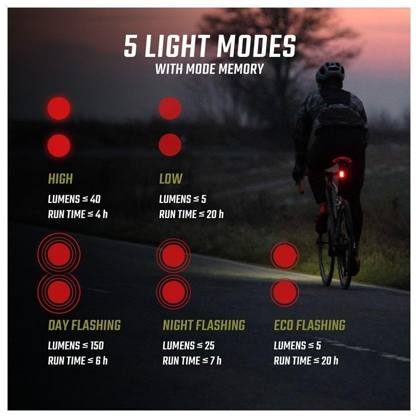 5 světelných režimů: High (40 lm), Low (5 lm), Day Flashing (150 lm), Night Flashing (25 lm), Eco Flashing (5 lm)