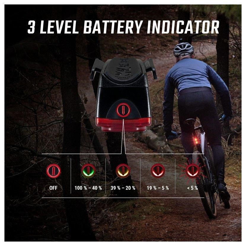 Světlo se zapíná dvojitým stisknutím. Velké tlačítko zapnutí lze snadno ovládat i v rukavicích. Tato funkce zajistí, že zadní světlo lze bez problémů schovat do kapsy dresu nebo do batohu, aniž by se nedopatřením rozsvítilo.