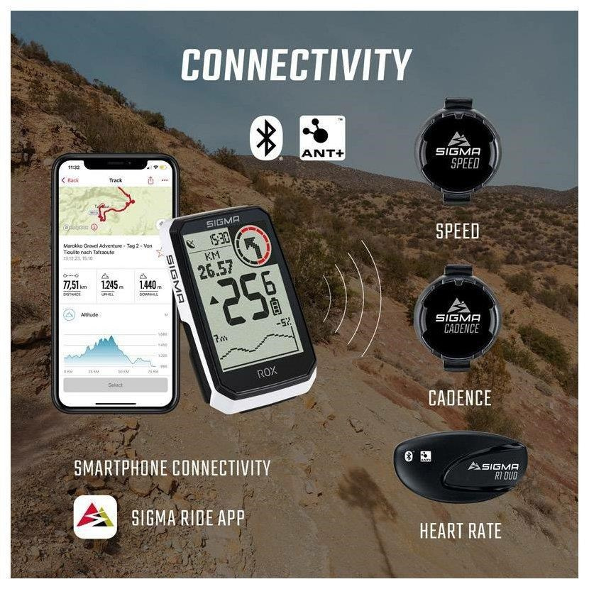 Prostřednictvím Bluetooth lze data z cyklopočítače odesílat do smartphone a v aplikaci SIGMA RIDE je ukládat a vyhodnocovat. Na smartphonu lze nastavit oblíbený vzhled displeje. Nejdůležitější data a statistiky lze pomocí funkce LIVE v aplikaci SIGMA RIDE zobrazovat a pohodlně vyhodnocovat i v reálném čase na smartphonu.