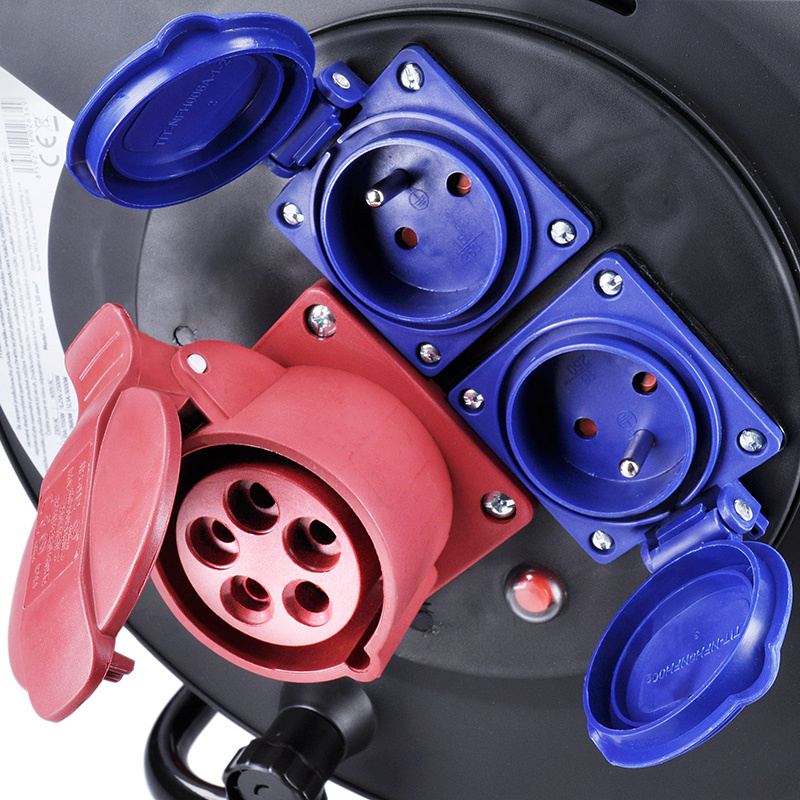 Přívod kombinuje jednu zásuvku na 400 V a dvě klasické zásuvky 230 V, což umožňuje napájet silové i běžné spotřebiče z jednoho místa. Svářečky, kotoučové pily, míchačky, kompresory, atd. Skvělý pomocník na stavbách, v dílnách i v náročných provozech.