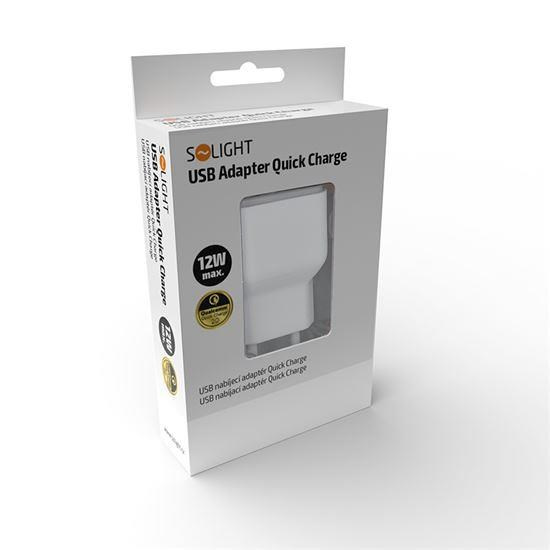 Solight USB nabíjecí adaptér, fast charge: 1x USB Qualcomm, 5V2A/9V1.5A/12V1A, AC 230V, bílošedý