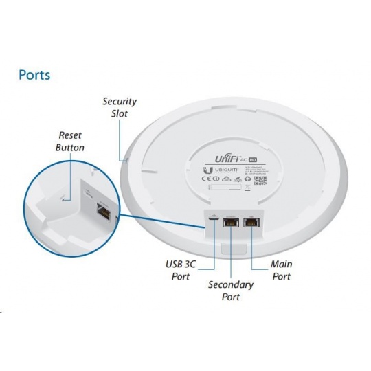 UniFi AP AC HD je první 802.11ac wave2 AP od Ubiquiti s celkovou propustností až 2533Mbps (2.4GHz 800Mbps + 5GHz 1733Mbps), Disponuje 4x4 MU-MIMO všesměrovými dvou-polarizačními dualband. 3dBi antény pro 2.4GHz a 4dBi pro 5GHz s výkonem rádiové části až 25dBm jak pro 2.4 tak i pro 5GHz současně. Podporuje standardy 802.11a/b/g/n/ac/ac wave2, disponuje dvěma gigabit.ethernet. porty (druhý je v bridgi). Lze napájet prostřednictvím aktnivního PoE dle 802.3at případně pasivního (48V DC), PoE adaptér je součástí balení (pasivní). Maximální spotřeba činní 17W.