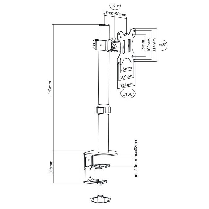 Stolní držák na monitor Tv Fiber Mounts M7C51 Kvalitní nastavitelný stolní držák na monitor nebo Tv 13-32", otočný +/- 90°, sklopný až +/- 45°, výškové nastavení od stolové desky, VESA standardy 75x75 a 100x100, nosnost 8kg, záruka 5 let Univerzální stolový držák pro uchycení monitoru nebo televize s úhlopříčkou 13-32". Držák podporuje VESA standardy 75x75 a 100x100, můžete zakoupit rozšíření na VESA 200x100 a 200x200. Spolehlivé a bezpečné upnutí na stolové desky, 2 typy stolních úchytů 10-88mm. Polohování obrazovky otáčením do stran až +/- 90°, náklonem až +/- 45° a výškovým nastavením od stolu max. 400mm. Velmi pevná a bezpečná konstrukce z oceli. Nosnost 8kg. Barevné provedení černé, záruka 5 let. Kvalitní monitorový a Tv držák na stůl do kanceláře, pracovny, učebny nebo domácnosti Fiber Mounts M7C51 Technické údaje: maximální zatížení 8kg podporuje VESA standardy 75x75 a 100x100 možnost rozšíření na VESA 200x100 nebo 200x200 doporučená úhlopříčka monitoru nebo televize 13 až 32" otáčení do stran +/- 90° náklon až +/- 45° celková výška 443mm výškové polohování obrazovky upnutí na vodorovnou plochu (stůl) o síle 10-88mm součástí balení 2 typy upnutí - na okraj nebo do prostoru bezpečné a spolehlivé uchycení obrazovky na stolovou desku úchytka na kabely materiál ocel barva černá záruka 5 let Stolní držák na monitor nebo televizi do kanceláře nebo domácnosti Fiber Mounts M7C51 Držák monitoru Fiber Mounts M7C51 podporuje VESA standardy: VESA 75x75 VESA 100x100 VESA 200x100 - za příplatek VESA 200x200 - za příplatek Na držák Fiber Mounts M7C51 je možné uchytit veškeré typy a značky monitorů nebo televizí, které podporují kterýkoliv z výše uvedených VESA standardů a jejichž hmotnost není vyšší jak 8kg..