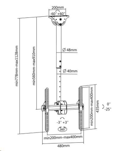 Stropní držák televize Fiber FN-T400 Stropní držák na Tv 32-60" plně polohovatelný, TOP kvalita Držák pro zavěšení televizorů a monitorů na stropní konstrukce. Držák je plně nastavitelný: otáčení do stran, náklon, délka od stropu, korekce roviny, i na šikmé stropy +/-60°, možnost kolmého otočení úchytu a instalace i na svislé plochy. Celoocelová konstrukce s vynikající pevností, možnost zavěsit televizory s hmotností i 50kg. Top kvalita, plná nastavitelnost, spolehlivost a bezpečnost, to jsou hlavní přednosti tohoto stropního držáku na televizory a monitory. Profesionální stropní držák na televize i monitory 32-65 palců, otočný do stran, možnost velkého náklonu, délkové nastavení, systém skrytého vedení kabeláže, nosnost 50kg. Stropní držák Tv Fiber FN-T400 Technické údaje: nosnost 50kg podpora VESA 200x100 až 400x400 na televize a monitory s úhlopříčkou 32" až 60" (dle VESA a hmotnosti i větší) nastavení délky držáku 560mm až 910mm otáčení do stran +/- 180° náklon 0° až -25° korekce roviny obrazu +/- 3° možnost zavěšení na vodorovné i na šikmé stropní konstrukce +/- 60° možnost zavěšení i na svislé plochy ocelová konstrukce výborné kvality systém pro skryté vedení kabeláže barevné provedení černé záruka 5 let Stropní držák na televize a monitory Fiber FN-T400 podporuje VESA standardy: VESA 200x100 VESA 200x200 VESA 300x100 VESA 300x200 a 200x300 VESA 300x300 VESA 400x200 a 200x400 VESA 400x300 a 300x400 VESA 400x400.