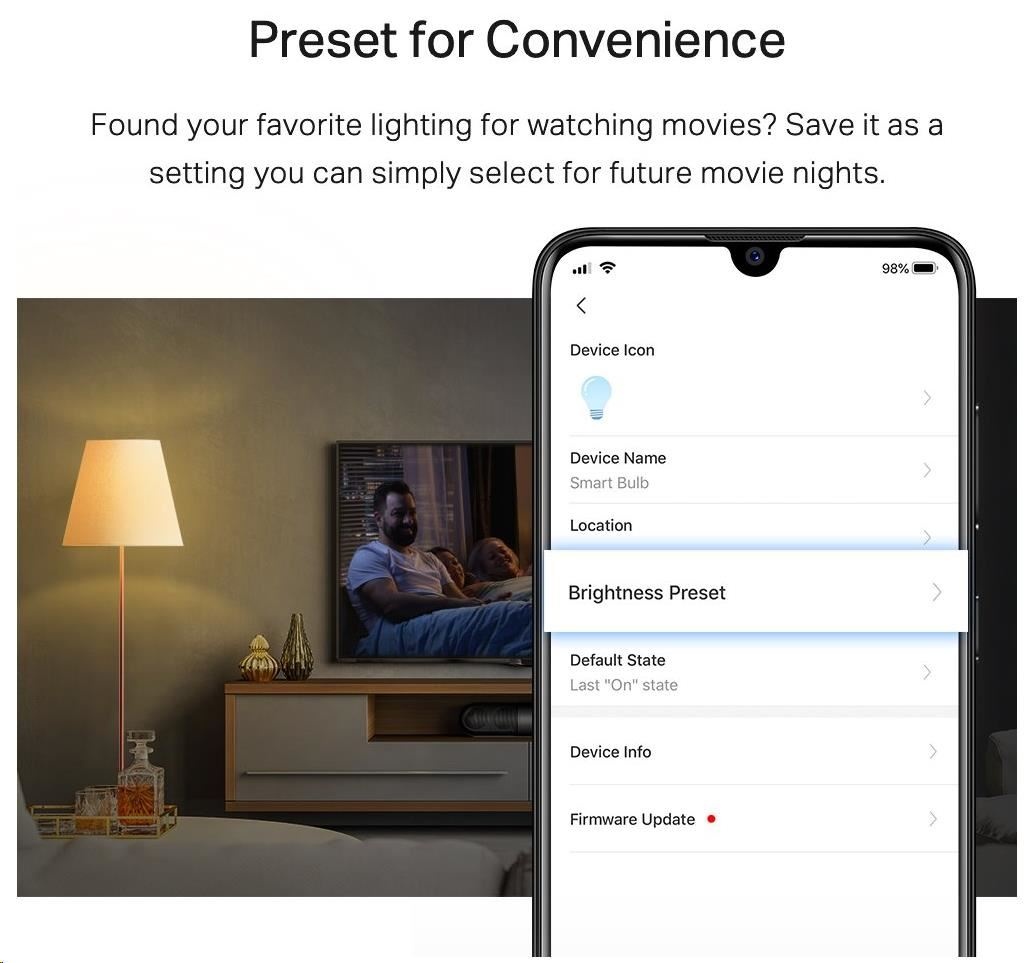 - Stmívatelná (nastavení pro vaše pohodlí) – Našli jste své oblíbené osvětlení pro sledování filmů? Uložte jej jako nastavení, které si můžete jednoduše vybrat pro budoucí filmové noci.