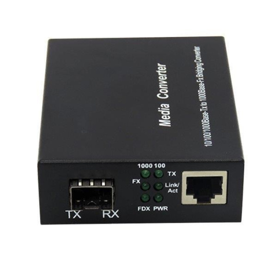 XtendLan XL-GT805A Konvertor převádí optický Gigabitový Ethernet přes vložený modul miniGBIC (SFP) na metalický Ethernet. Zařízení disponuje jedením ethernetovým portem 10/100/1000 Mbps a jedním optickým portem 1,25 Gbps. Umožňuje propojení přes optické vlákno až na vzdálenost 100 km. Maximální délka metalického spoje je 100 m. Výhodami jsou vysoká izolační ochrana, dobrá bezpečnost dat, pracovní stabilita a snadná údržba.  Konvertor pro přechod mezi metalickým a optickým spojem pro Gigabitový Ethernet. Nutné zakoupit SFP optický modul. Automatická detekce rychlosti připojeného přepínače 10/100/1000 Mbps.  ZÁKLADNÍ SPECIFIKACE  Konektory: 1x RJ-45, 1x SFP  Napájení z externího adaptéru: 5 V, příkon do 3 W, napájecí zdroj je součástí balení  JumboFrame: 9 KB  Rozměry: 94 x 70 x 26 mm  Hmotnost: 350 g.