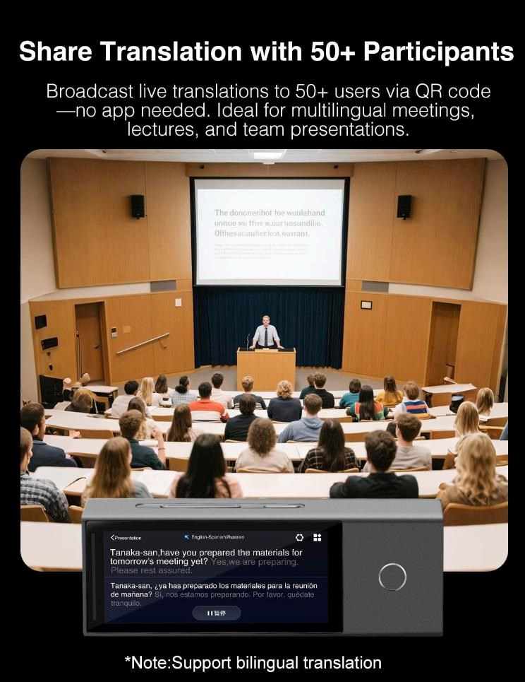 X1 funguje samostatně nebo ve spojení se sluchátky, což přináší maximální flexibilitu pro různé situace. Podporuje připojení až 20 zařízení, která lze snadno synchronizovat do jedné skupinové konverzace. Uživatelé mohou komunikovat v reálném čase a každý slyší překlad ve svém jazyce. Ideální řešení pro firemní porady, workshopy nebo mezinárodní konference. Umožněte svým týmům mluvit svobodně bez jazykových bariér a posilte spolupráci na všech úrovních.