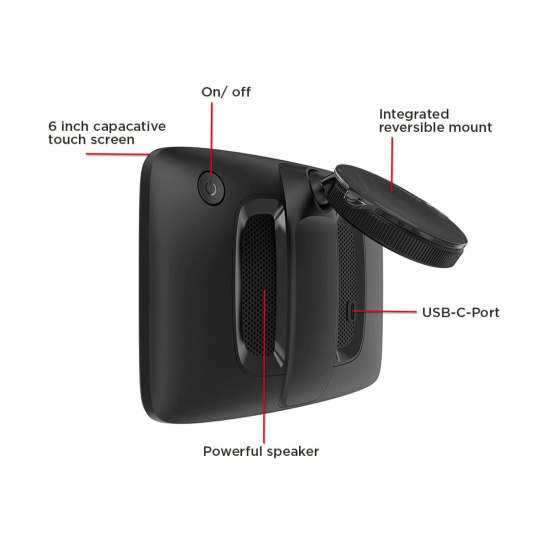 Sledujte svou trasu na 6" dotykové obrazovce s vysokým rozlišením pro bezpečnější jízdu a díky výkonnému reproduktoru snadno uslyšíte každý signál. Výkonný reproduktor zajistí zřetelné mluvené pokyny.