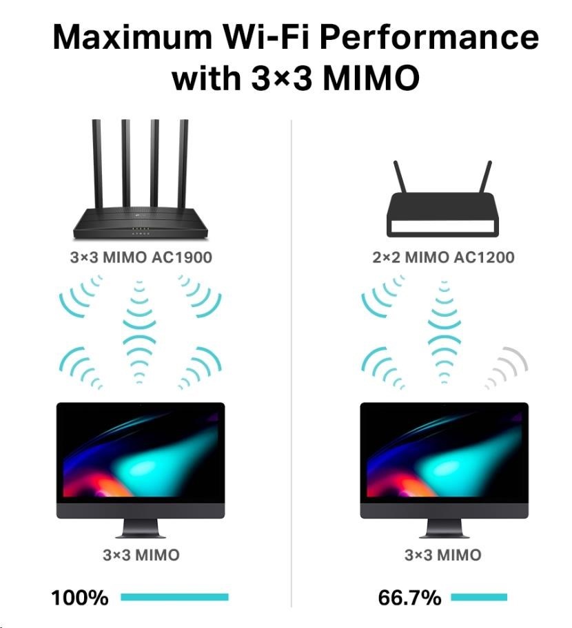 - 3×3 MIMO technologie – Přenos a příjem dat ve třech proudech pro bezproblémové spárování s vašimi 3 × 3 klienty.