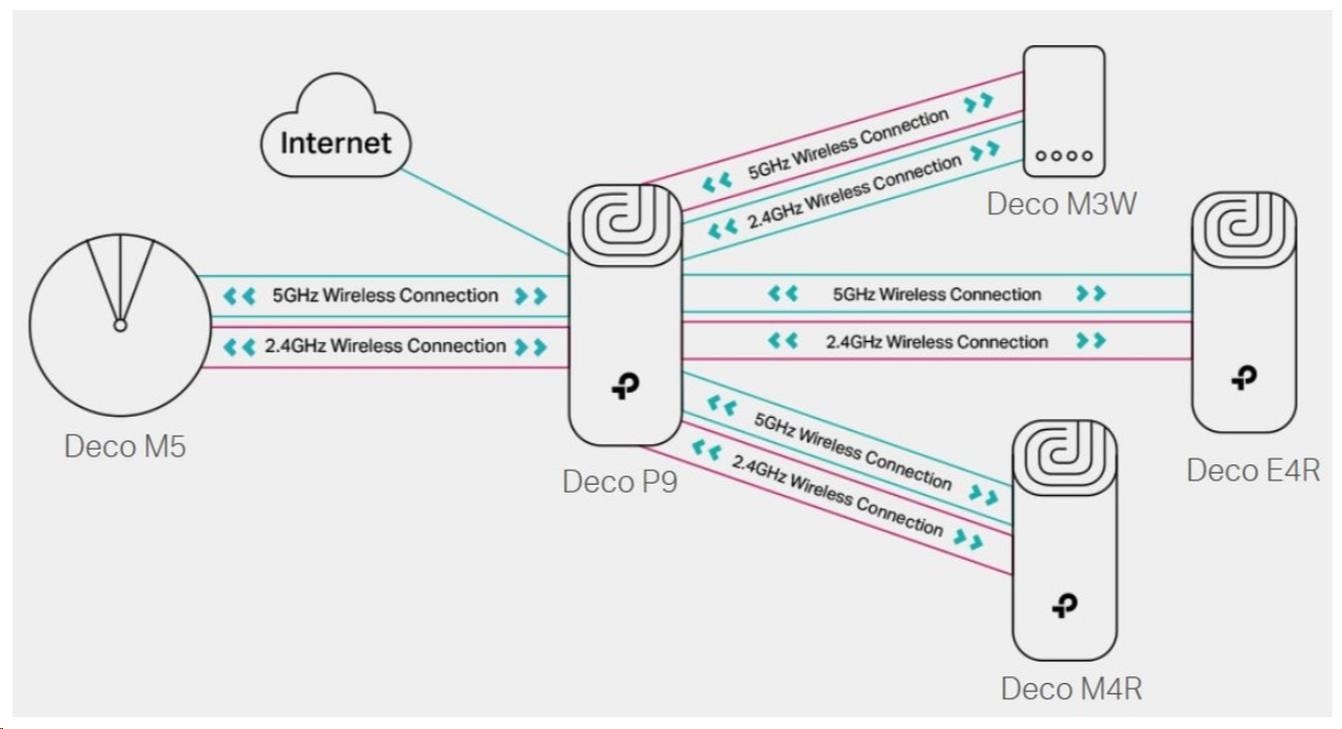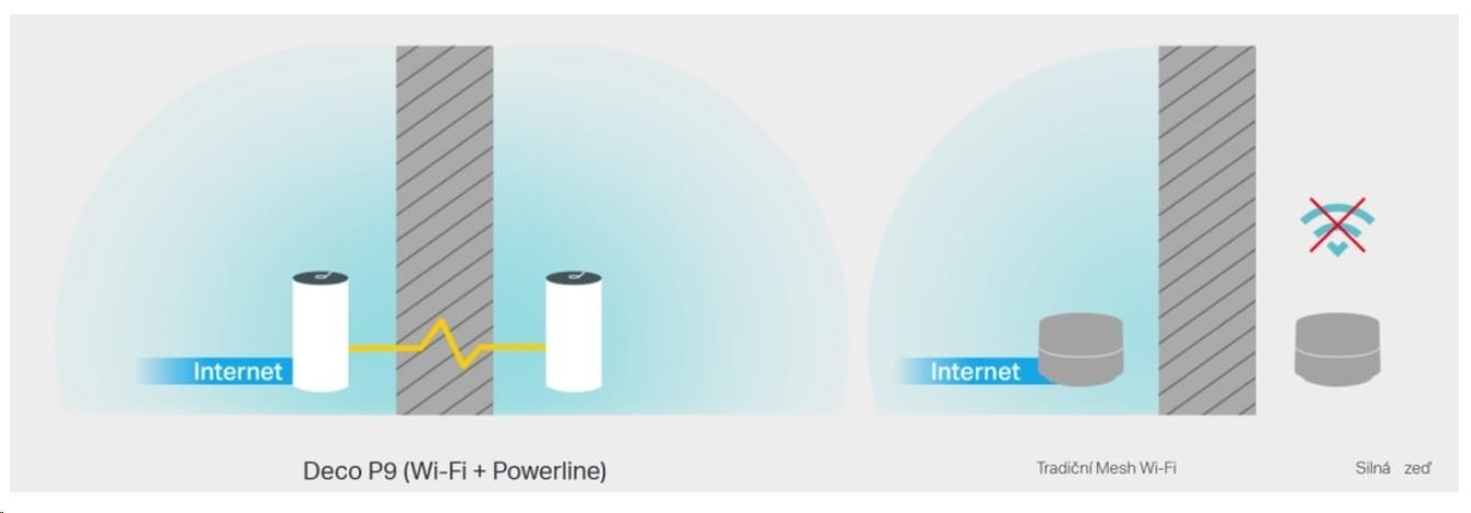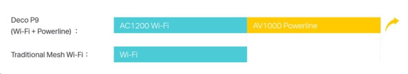 Deco P9 kombinuje duální Wi-Fi a powerline pro vytvoření silnější mesh sítě. Technologie Powerline využívá elektrické rozvody vašeho domu k vytvoření silnějšího propojení mezi jednotkami Deco tím, že snižuje dopad stěn a jiných překážek na signál a poskytuje ještě vyšší rychlosti sítě a skutečně bezproblémové pokrytí.