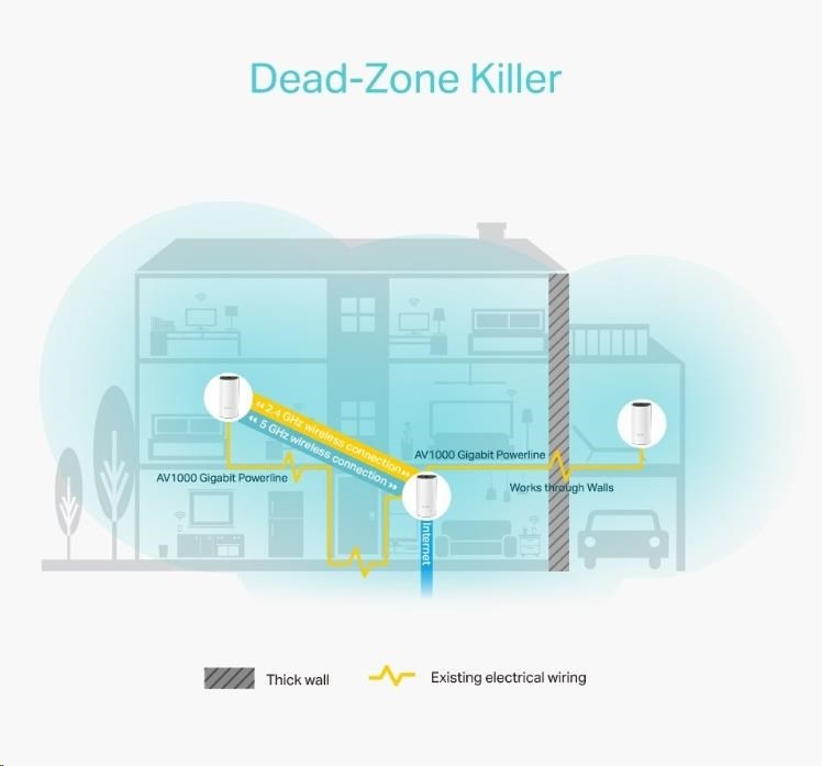Deco P9 kombinuje duální Wi-Fi a powerline pro vytvoření silnější mesh sítě. Technologie Powerline využívá elektrické rozvody vašeho domu k vytvoření silnějšího propojení mezi jednotkami Deco tím, že snižuje dopad stěn a jiných překážek na signál a poskytuje ještě vyšší rychlosti sítě a skutečně bezproblémové pokrytí .