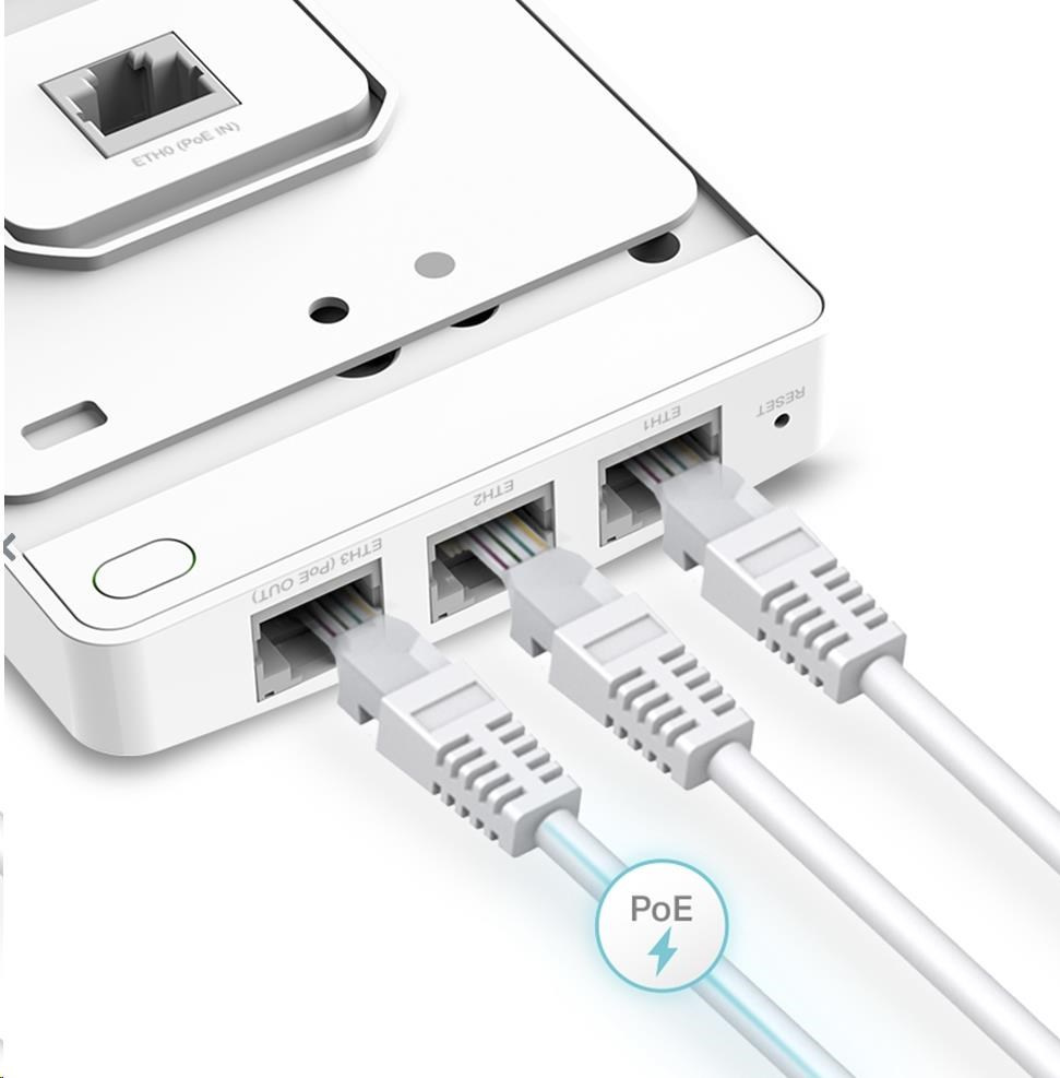 AP disponuje celkem 4 Gigabitovými LAN porty, z čehož první port podporu PoE IN a normy 802.3af/at. Poslední port navíc podporuje i PoE-throughput (PoE-out) a může tak napájet další zařízení jako například VoIP, IP kameru a jiné.