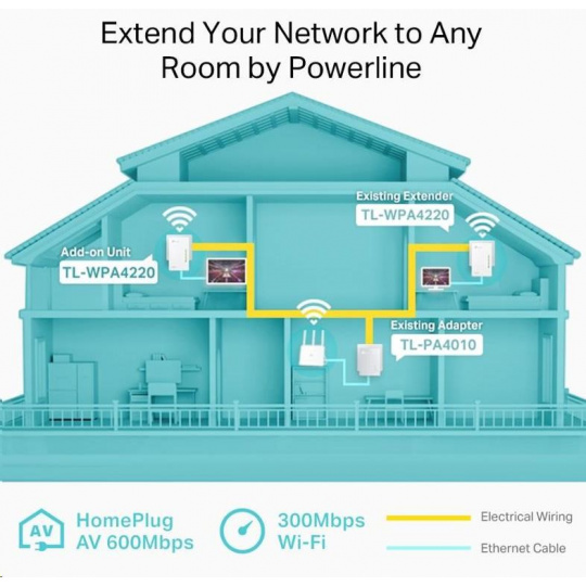 TL-WPA4220 přemění vaši stávající elektrickou síť na vysokorychlostní internetovou síť bez nutnosti dalších kabelů či vrtání. Rozšiřující jednotka TL-WPA4220 podporuje sofistikovaný standard HomePlug AV2 a je perfektním řešením pro rozšíření existující sítě vedené přes elektrické rozvody. Poskytuje spolehlivé a vysokorychlostní datové přenosy až 600 Mbit/s přes vedení dlouhé až 300 metrů a současně propojuje kabelovou a bezdrátovou síť všude tam, kde je k dispozici elektrická zásuvka.