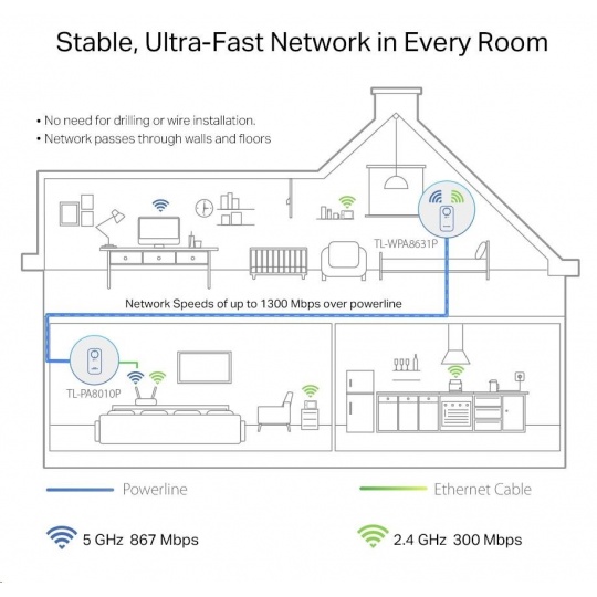| Package Contents | AV1300 Gigabit Passthrough Powerline ac Wi-Fi KIT: 1× TL-WPA8631P, 1× TL-PA8010P; 2× Ethernet Cables; 1× Quick Installation Guide |