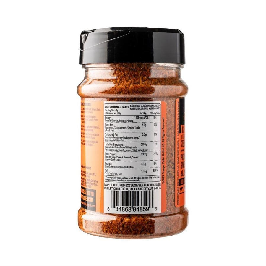 Naše koření Traeger Rub představuje dokonalou směs sladké, slané a pikantní chuti, která zvýrazní chuť jakéhokoli masa, na které ho nanesete. Pikantní česnek se snoubí s bylinkovými tóny bazalky a oregana a jemnou kouřovou chutí papriky a chilli papriček, které doplňují vše od libového kuřecího masa až po výraznou hovězí hrudí.
